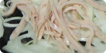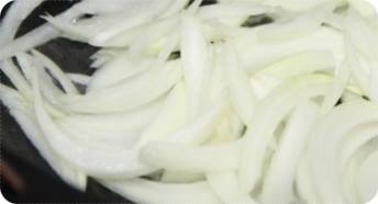그 다음 단계는 후라이팬을 예열한 뒤 기름을 두르고 양파를 먼저 볶도록 합니다. 양파는 투명해질때까지 계속 볶아줘야 단맛이 납니다. 잘 타지 않게끔 중불에서 잘 저어주면서 양파가 투명해진다면 그때 햄을 넣어주도록 합니다. 햄 대신 당근을 넣는다면 이 때 당근을 먼저 넣어주도록 합니다.