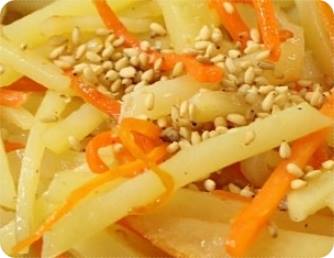 위 팁처럼 하고난 뒤 감자채가 투명해졌따면 이제 청주를 넣고 다시 또 중불에서 빠르게 볶아주도록 합니다. 이 때부터는 계속 뚜껑을 덮지 않고 열어두도록 합니다. 그 다음 소금과 후추로 간을 한 다음에 다시 한 번 또 섞어주도록 합니다. 다만 감자채를 너무 세게, 그리고 자주 섞어주다 보면 감자채가 익으면서 다 부스러지기 때문에 타지 않을 정도로만 지켜본 뒤 가끔씩 볶아주도록 합니다.