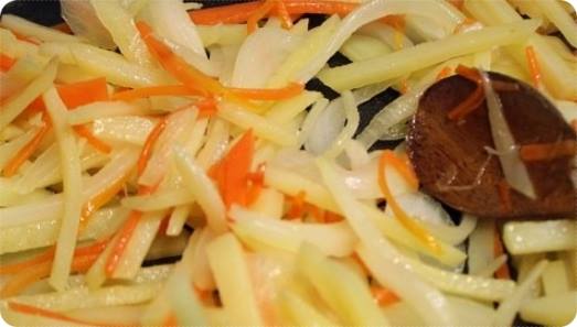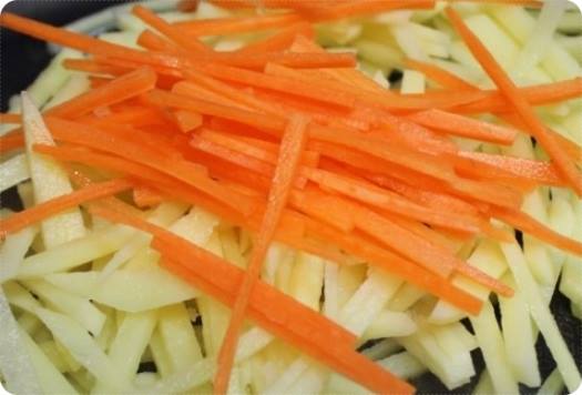 이런 식으로 다 볶아준 뒤 마지막에 감자채를 넣어서 한꺼번에 볶아주도록 합니다. 중불에서 감자채까지 두루두루 볶아주고 난 뒤에는 약불에서 후라이팬 뚜껑을 덮은 뒤 감자채를 익혀주도록 합니다.