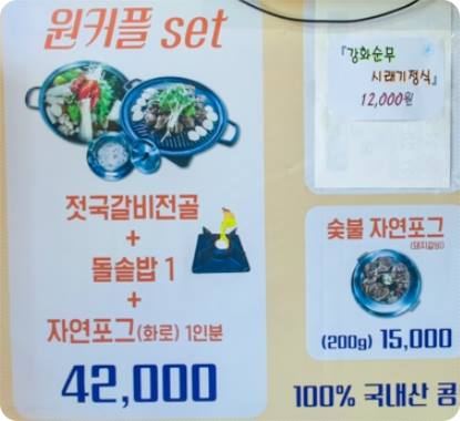 매 월 첫째 셋째주 수요일은 휴무이므로 이 점 참고하고 가시기 바랍니다. 원커플 set나 젓국갈비전골로 먹어도 되고 대부분 원커플 set로 먹는 편입니다. 젓국갈비전골과 돌솥밥, 글고 자연포그 1인분으로 구성된 세트입니다. 강화도에서 한번도 젓국갈비 드셔보시지 못했다면 이곳에서 먹어보시기 바랍니다.