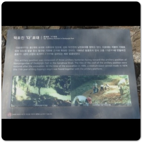 김포 가볼만한곳 베스트10 마지막 추천 장소는 김포 덕포진입니다. 위치는 김포시 대곶면 신안리 224-3에 위치하고 있습니다. 이곳은 사적 292호로 지정된 곳입니다. 과거에는 강화도 해협을 지난 뒤 서울로 들어오는 외국 함선을 방어하기 위해 만들었던 대포 진지였습니다.