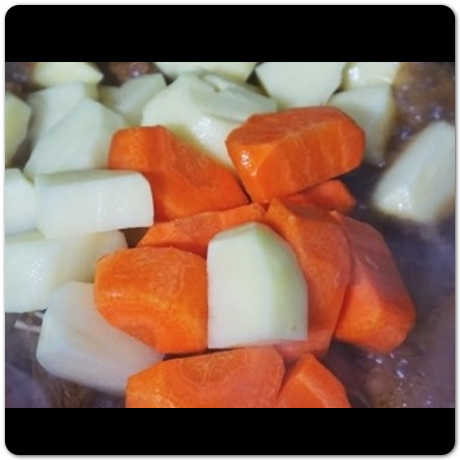 갈비가 먼저 익고 있을 때 이제 야채를 넣어주도록 합니다. 당근과 감자를 먼저 넣어서 센불에서 함께 끓이다가 국물이 1/3 정도로 줄기 시작하면 강불에서 중불로 불 세기를 조절하도록 합니다.