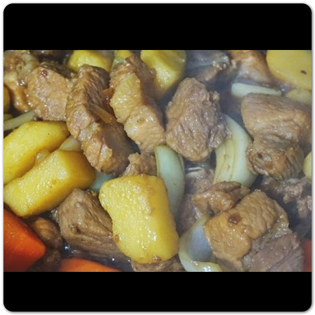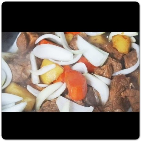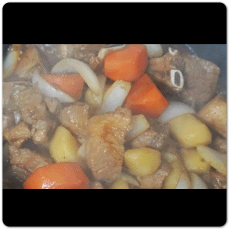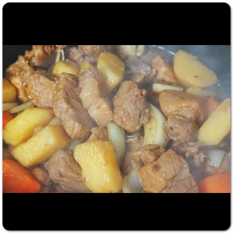 당근과 감자를 젓가락으로 찔러봤을 때 어느 정도 익은 것 같으면 그때 양파를 넣도록 합니다. 양파를 감자, 당근과 함께 처음부터 넣어버리면 양파가 흐물거려서 양파 모양이 제대로 보이지 않습니다. 익은 것 같으면 그때 양파를 넣도록 하고, 중간에 간을 한 번 살짝 본 뒤 싱겁게 느껴지거나 양념이 부족하게 느껴진다면 1/2 남은 것 중 조금씩 부어서 간을 보도록 합니다.