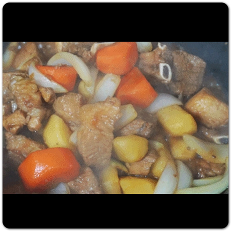 당근과 감자를 젓가락으로 찔러봤을 때 어느 정도 익은 것 같으면 그때 양파를 넣도록 합니다. 양파를 감자, 당근과 함께 처음부터 넣어버리면 양파가 흐물거려서 양파 모양이 제대로 보이지 않습니다. 익은 것 같으면 그때 양파를 넣도록 하고, 중간에 간을 한 번 살짝 본 뒤 싱겁게 느껴지거나 양념이 부족하게 느껴진다면 1/2 남은 것 중 조금씩 부어서 간을 보도록 합니다.