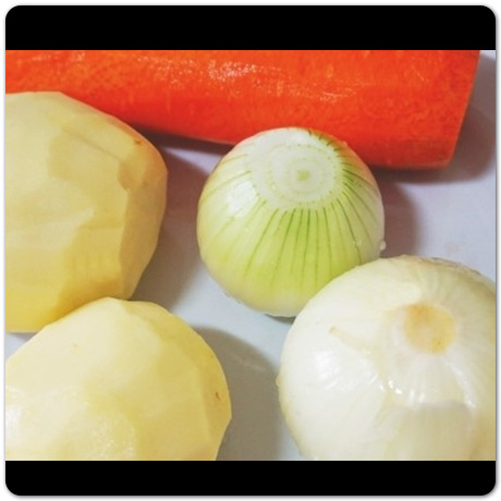 돼지갈비찜 맛있게 만드는 법 기본 야채를 모두 다졌다면 이제 채소를 손질할 차례입니다. 먼저 당근과 감자는 밤톨만한 크기로 토막내주면 됩니다. 그리고 양파는 결대로 썰어주면 됩니다. 밤톨만한 크기로 썰어줘야 익히는 과정 중 덜익은 부분 없이 푹 잘 익힐 수 있습니다.