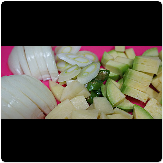 그 뒤, 애호박과 양파, 대파, 청양고추도 깨끗하게 씻은 뒤에 손질해주면 됩니다. 감자와 애호박은 먹기 좋은 크기로 사각썰기해주면 됩니다. 그리고 양파는 채썰어주고 대파는 송송 썰어주면 됩니다. 이렇게 재료를 준비하되, 만일 매운 걸 잘 못먹는다면 청양고추는 제외해도 됩니다.