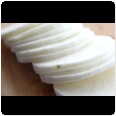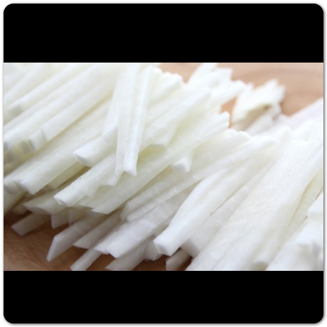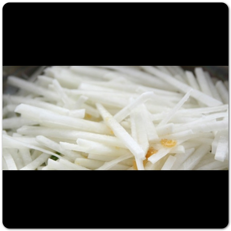 얇게 썰게 되면 익는 과정에서 무가 대부분 부서질 수 있기 때문에 적당한 사이즈로 채썰어주도록 합니다. 무 채썰기가 어렵다면 일단 채썰기 전에 무의 밑 바닥을 납작하게 잘라준 다음에 무를 고정시킨 뒤 칼로 썰면 안정적으로 채썰기를 할 수 있습니다.