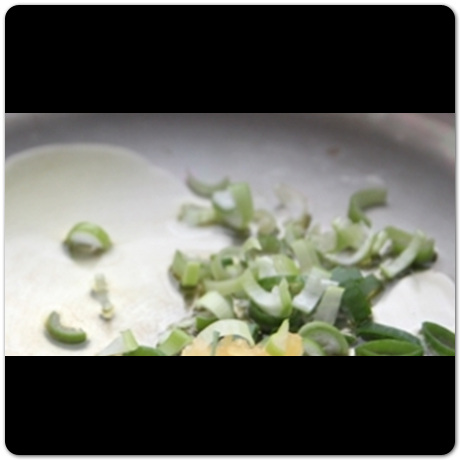 모든 재료를 다 준비했다면 이제 후라이팬을 예열해줍니다. 후라이팬 예열 뒤, 들기름을 2~3스푼 정도 둘러준 다음에 다진 마늘 1스푼과 대파 한 줌을 넣고 함께 볶아주면 됩니다.
