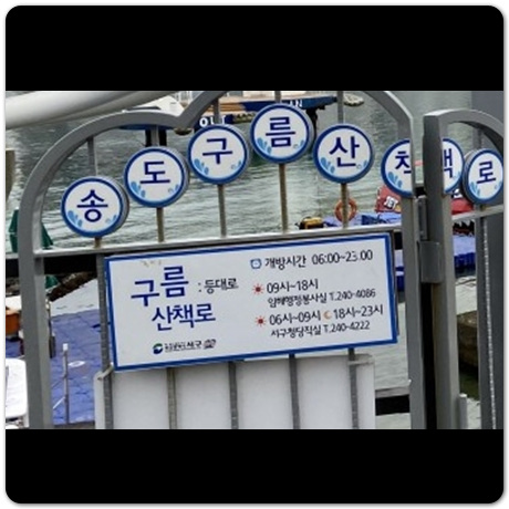 다섯번째 추천 장소는 송도 구름 산책로입니다. 위치는 부산 서구 암남동 129-4에 위치해있습니다. 송도 구름 산책로는 새벽 6시부터 밤 11시까지 문을 열어놓으므로 여유롭게 다녀갈 수 있습니다. 오전 6~9시, 저녁 6시부터 밤 11시까지 당직실에서 관리를 따로 해줍니다.