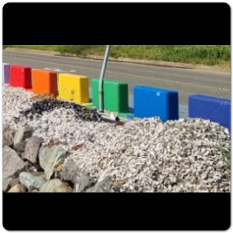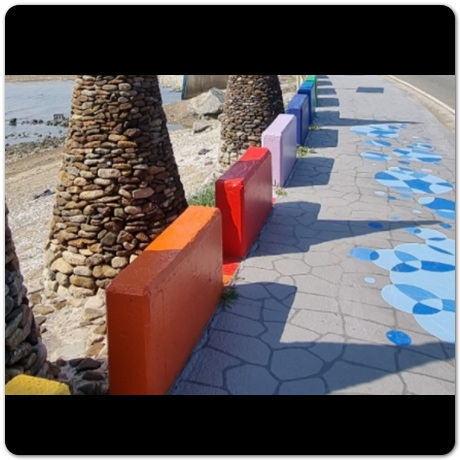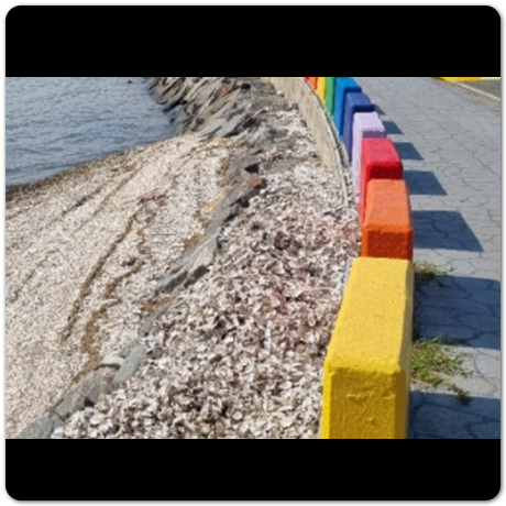 사천 가볼만한곳 베스트10 네 번째 추천 장소는 무지갯빛 해안도로입니다. 위에서 언급한 거북선 마을 가는 길에 있으므로 해안도로에서 산책한 뒤 거북선 마을로 향하는 코스로 정하면 좋을 듯 합니다. 이곳은 남양동 미룡항 구간부터 용현면 송지리까지 노후된 방호벽을 무지갯빛으로 알록달록 예쁘게 꾸며놓은 길입니다.