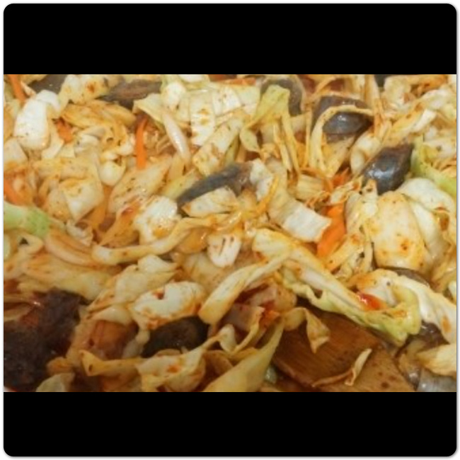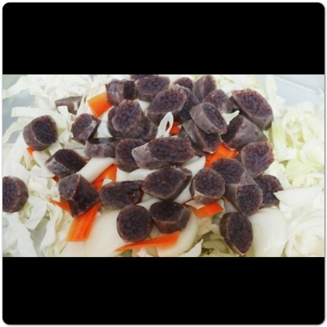 순대볶음 만드는 방법 기름 두른 철판(후라이팬)이 충분히 달궈졌다면 이제 제일 먼저 야채를 깔아주도록 합니다. 집에 떡볶이 떡이 있다면 순대와 떡볶이 떡 함께 씹히는 맛도 좋으니 야채 깔 때 함께 올려주도록 합니다. 제일 바닥면은 야채, 그리고 그 위에 떡볶이용 떡을 먹을 만큼만 올려놓으면 됩니다. 그리고 그 위에 좀 전에 썰어뒀던 순대도 함께 올려주면 됩니다.
