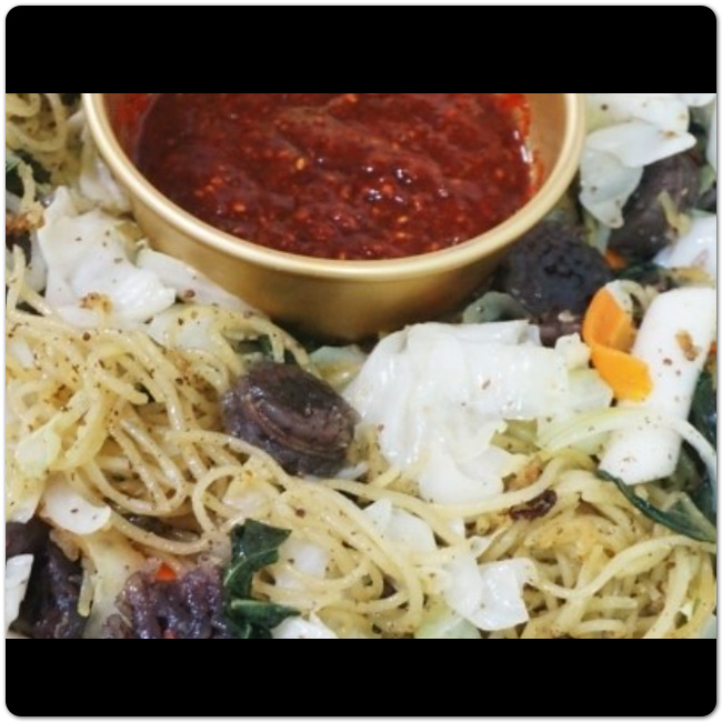 아무래도 볶음 먹을 때 쫄면도 함께 먹으면 맛있으니 집에 쫄면 사리 있으면 이것도 순대 바로 위에 깔아주면 됩니다. 그리고 순대볶음 밑간을 위해 다진마늘1스푼, 소금약간, 후추약간 넣어주면 됩니다. 여기까지 한 뒤 강불에서 5분 정도 익혀주면 됩니다. 계속 불이 세면 안되므로 중간에 다시 중불로 줄인 다음에 계속해서 잘 뒤적뒤적 해주면 됩니다. 처음에는 양이 많아 보여도 이렇게 뒤적뒤적 해주다보면 야채 숨이 금방 죽어서 양이 금방 줄어듭니다.