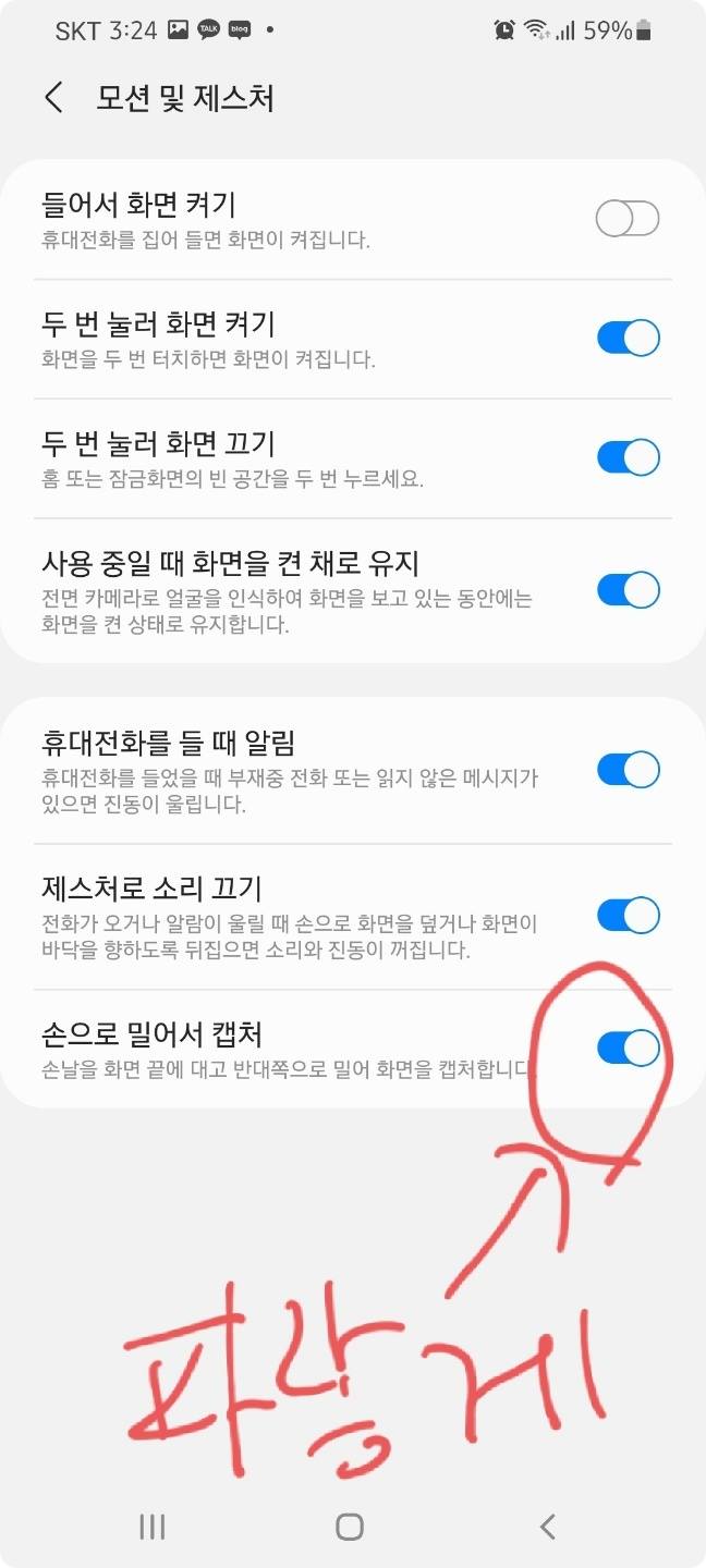 4. 하단에 보면 '손으로 밀어서 캡처'라는 부분이 있습니다. 여기가 활성화되어야만 손으로 밀었을 때 캡처가 됩니다. 아래 사진을 보면 활성화가 됐을 때의 모습과 활성화가 되지 않았을 때의 모습입니다.