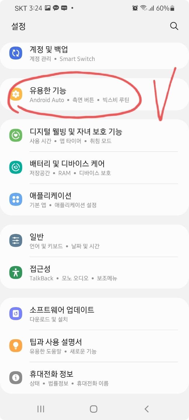 2. 설정에 들어간 후, '유용한 기능'을 찾아 주시기 바랍니다.