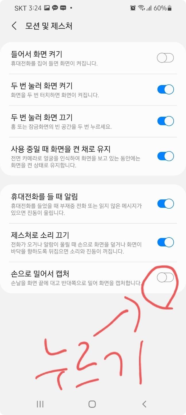 4. 하단에 보면 '손으로 밀어서 캡처'라는 부분이 있습니다. 여기가 활성화되어야만 손으로 밀었을 때 캡처가 됩니다. 아래 사진을 보면 활성화가 됐을 때의 모습과 활성화가 되지 않았을 때의 모습입니다.