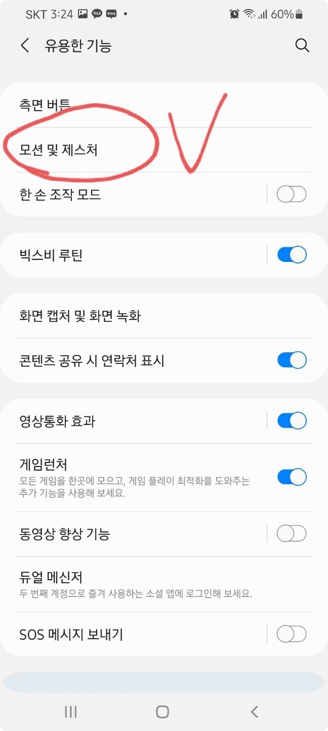 두 번째 방법은 손으로 밀어서 화면을 캡처하는 방법입니다. 만일 손으로 밀어서 캡쳐하는 방법이 설정되어 있지 않다면 그걸 먼저 설정한 후 손으로 밀어야 캡처가 완벽하게 됩니다. 먼저 아래 순서대로 설정이 제대로 되어있는지 확인해주시기 바랍니다.