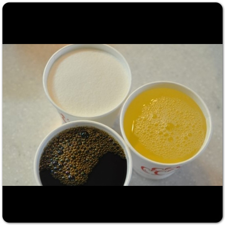 물과 간장, 설탕, 식초를 모두 똑같은 비율로 종이컵에 담으면 됩니다. 집에 종이컵이 없으면 똑같은 높이의 컵 4개를 준비해서 거기에 설탕과 물, 간장, 식초를 똑같은 양으로 담아두면 됩니다.