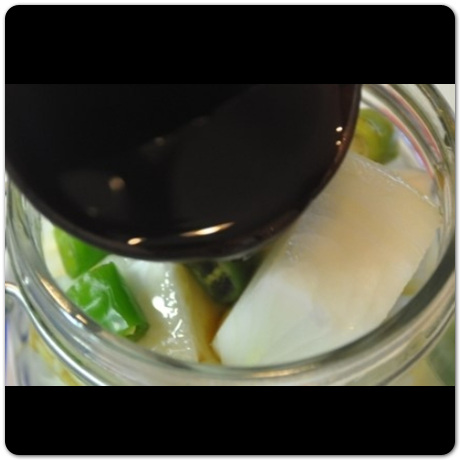양파장아찌 담그는법 양파와 청양고추를 차곡차곡 잘 넣었다면 마지막으로 펄펄 끓었던 간장을 넣어줍니다.