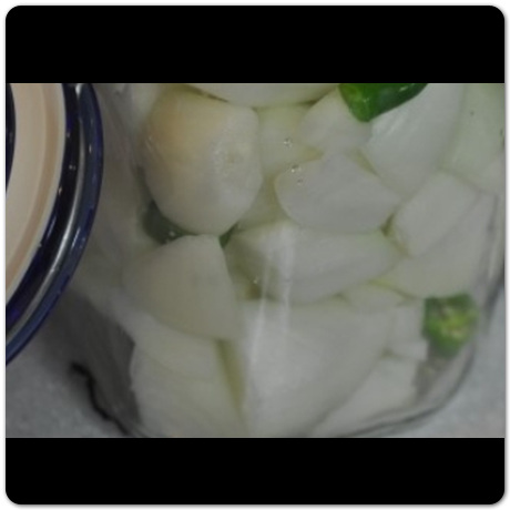 6등분한 양파를 소독한 유리병에 넣어주도록 합니다. 그리고 송송 썰었던 청양고추도 같이 넣어줍니다.