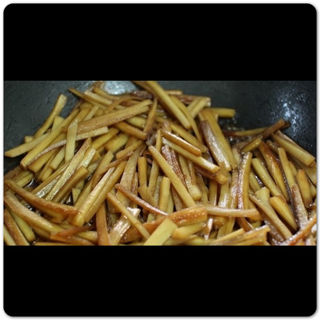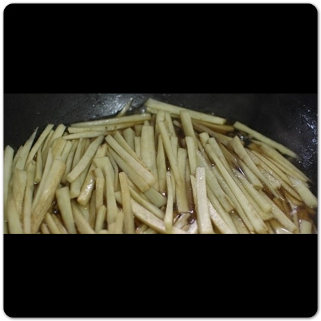 찬물에 헹군 뒤 체에 놔둬서 물기를 없앴다면 이제 후라이팬에 식용유를 두른 뒤 우엉을 볶아주도록 합니다. 볶는 과정이 곧 우엉 겉면을 코팅해주는 작업을 해주므로 양념장을 바로 투하하기 전에 이렇게 1차로 우엉을 먼저 볶아주도록 합니다.