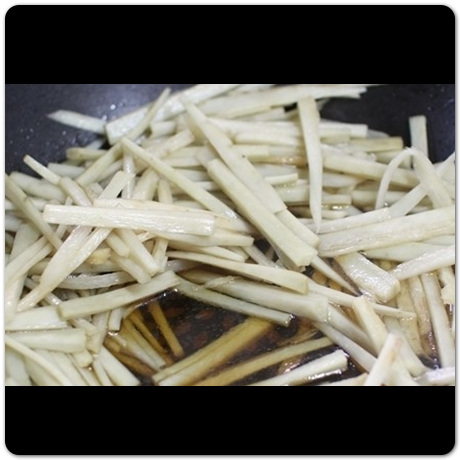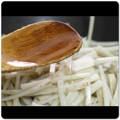 우엉조림 맛있게 하는법 이렇게 채썰어놓은 우엉은 대야에 물을 받은 뒤 식초를 1~2방울 정도 떨어트리고 그 안에 잠깐 넣어놓습니다. 이렇게 해놓으면 우엉이 갈변하는 것을 예방할 수 있습니다.