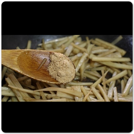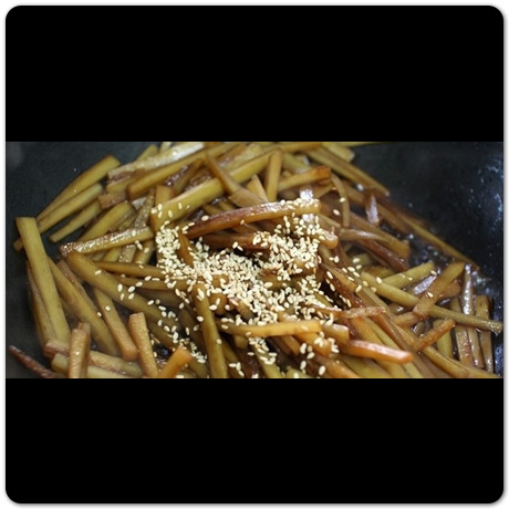 간장 양념이 줄어들기 시작했다면 이제 설탕을 넣어주도록 합니다. 설탕은 반스푼 정도 넣고 볶아주도록 합니다. 볶으면서 간을 보고, 조금 더 달달한 맛이 나야될 것 같으면 설탕을 조금씩 더 추가해주면 됩니다. 그 다음 약불에서 한 번 더 조려주도록 하고, 간장 양념이 다 없어졌다면 물을 아주 조금씩만 추가해서 조려주면 됩니다. 그 다음 가장 마지막에 센불에서 다시 한 번 볶아서 우엉색을 좀 더 진하게 한 뒤, 통깨를 뿌려주도록 합니다. 이상 우엉조림 맛있게 하는법이었습니다.