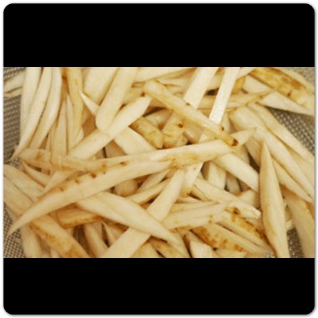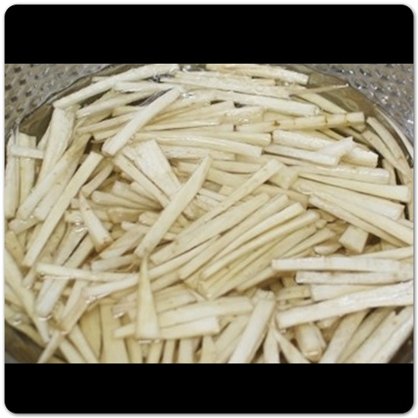 이렇게 4등분 한거는 다시 채썰기해주면 됩니다. 너무 두껍지도 , 그렇다고 너무 얇지도 않게끔 적당한 크기로 채썰어주면 됩니다. 참고로 두껍게 썰어주면 조림할 때 간장양념이 우엉에 제대로 스며들지 않게 됩니다.