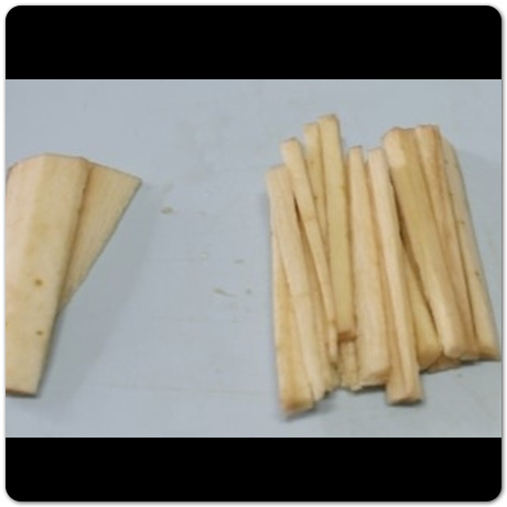 이렇게 4등분 한거는 다시 채썰기해주면 됩니다. 너무 두껍지도 , 그렇다고 너무 얇지도 않게끔 적당한 크기로 채썰어주면 됩니다. 참고로 두껍게 썰어주면 조림할 때 간장양념이 우엉에 제대로 스며들지 않게 됩니다.