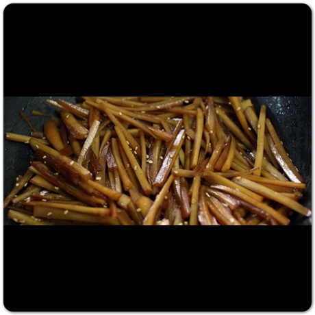 간장 양념이 줄어들기 시작했다면 이제 설탕을 넣어주도록 합니다. 설탕은 반스푼 정도 넣고 볶아주도록 합니다. 볶으면서 간을 보고, 조금 더 달달한 맛이 나야될 것 같으면 설탕을 조금씩 더 추가해주면 됩니다. 그 다음 약불에서 한 번 더 조려주도록 하고, 간장 양념이 다 없어졌다면 물을 아주 조금씩만 추가해서 조려주면 됩니다. 그 다음 가장 마지막에 센불에서 다시 한 번 볶아서 우엉색을 좀 더 진하게 한 뒤, 통깨를 뿌려주도록 합니다. 이상 우엉조림 맛있게 하는법이었습니다.