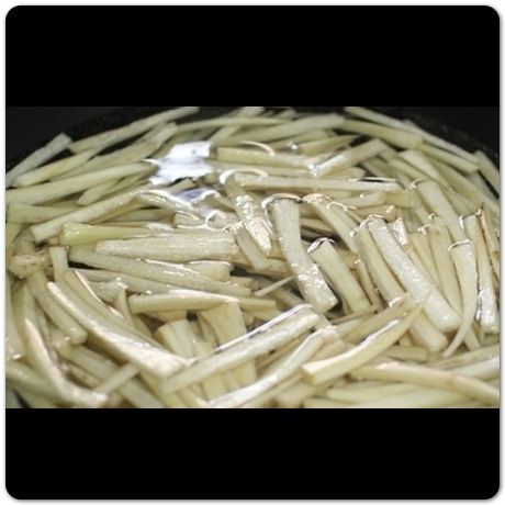 찬물에 헹군 뒤 체에 놔둬서 물기를 없앴다면 이제 후라이팬에 식용유를 두른 뒤 우엉을 볶아주도록 합니다. 볶는 과정이 곧 우엉 겉면을 코팅해주는 작업을 해주므로 양념장을 바로 투하하기 전에 이렇게 1차로 우엉을 먼저 볶아주도록 합니다.