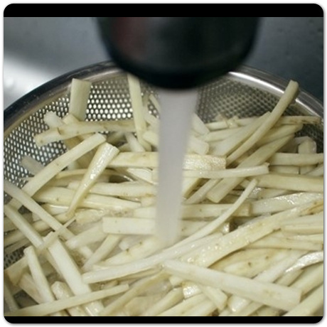 우엉조림 맛있게 하는법 이렇게 채썰어놓은 우엉은 대야에 물을 받은 뒤 식초를 1~2방울 정도 떨어트리고 그 안에 잠깐 넣어놓습니다. 이렇게 해놓으면 우엉이 갈변하는 것을 예방할 수 있습니다.