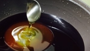 이제 간장과 물엿을 준비할 차례입니다. 간장, 물엿 비율은 1:2면 됩니다. 간장 1일 때 물엿 2의 비율로 준비하면 됩니다. 먼저 물엿을 1스푼 냄비에 넣고 간장은 반컵만 냄비에 부어주도록 합니다. 그리고 식용유는 대략 5숟가락 정도를 넣고 이번에도 센 불로 해놓은 뒤 당면을 넣어주도록 합니다.
