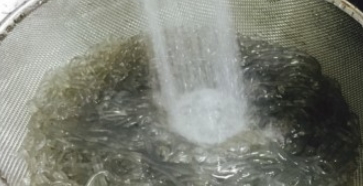 세 번째 단계입니다. 잡채 맛있게 만드는 방법 10분 정도 당면을 삶았다면 이제 바로 찬물에 헹궈주도록 합니다. 삶은 당면을 체에 놔둔 후 물기를 충분히 빼주도록 합니다. 삶고난 이후에 바로 당면을 찬물에 헹궈야만 면이 훨씬 쫄깃하고 맛있게 됩니다. 이 점 참고해서 진행해주시기 바랍니다.