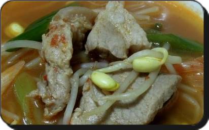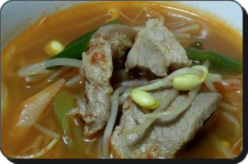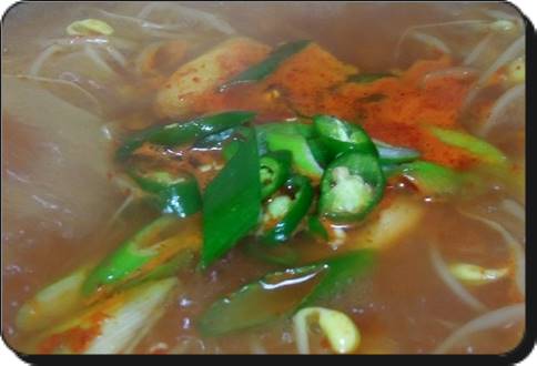 간을 하고난 뒤 한소끔 더 끓이고난 뒤 다시 한 번 간을 봐서 부족한 부분을 채우고 그 다음 한소끔 끓일 때 청양고추와 대파를 넣으면 됩니다. 이렇게 끓고난 뒤 먹으면 돼지고기 밑간을 잘해놔서 전혀 잡내 없이 깔끔하게 먹을 수 있습니다.
