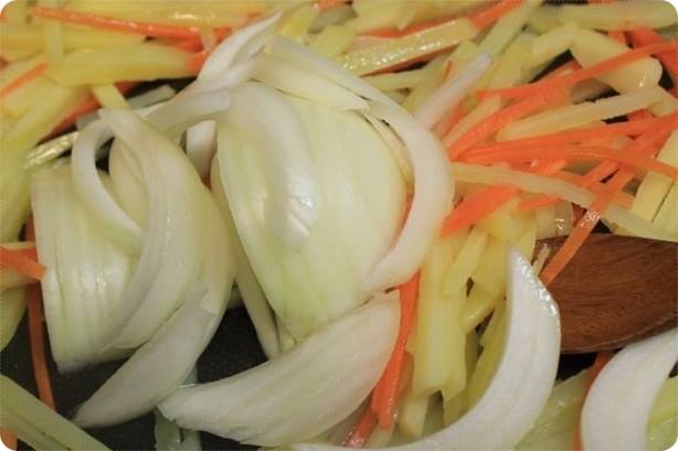 그 다음 단계는 후라이팬을 예열한 뒤 기름을 두르고 양파를 먼저 볶도록 합니다. 양파는 투명해질때까지 계속 볶아줘야 단맛이 납니다. 잘 타지 않게끔 중불에서 잘 저어주면서 양파가 투명해진다면 그때 햄을 넣어주도록 합니다. 햄 대신 당근을 넣는다면 이 때 당근을 먼저 넣어주도록 합니다.