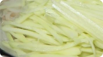 감자볶음 맛있게 만드는법 먼저 감자 전분을 제거해줘야 합니다. 감자를 먼저 채칼을 활용해서 껍질을 벗긴 뒤 대략 3mm 정도 굵기로 채 썰어 주도록 합니다. 미리 물에 소금을 녹여놓은 뒤 소금물을 만들고 놓고서 전분을 제거해주도록 합니다.
