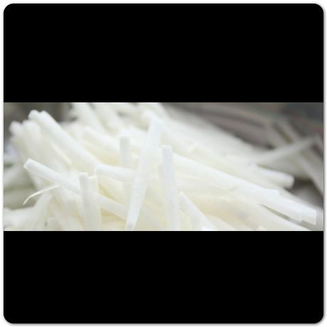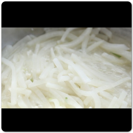 얇게 썰게 되면 익는 과정에서 무가 대부분 부서질 수 있기 때문에 적당한 사이즈로 채썰어주도록 합니다. 무 채썰기가 어렵다면 일단 채썰기 전에 무의 밑 바닥을 납작하게 잘라준 다음에 무를 고정시킨 뒤 칼로 썰면 안정적으로 채썰기를 할 수 있습니다.
