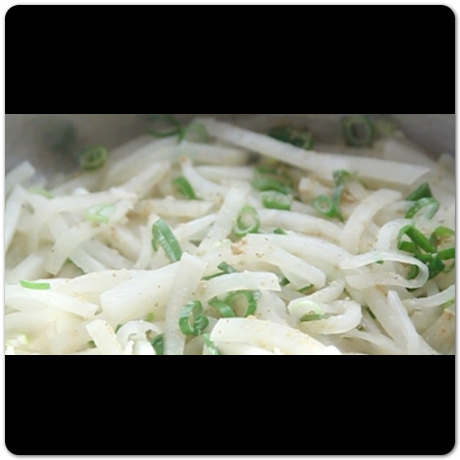 무나물 맛있게 하는 법 마늘향이 올라오기 시작했다면 이제 채썰었던 무를 넣어주도록 합니다. 그리고 소금 1.2스푼, 생강청 1스푼, 쌀뜨물 150ml, 설탕 1/2스푼을 넣고 잘 볶아주도록 합니다. 그 다음, 뚜껑을 덮어줘서 조리듯 그대로 놔두면 됩니다.